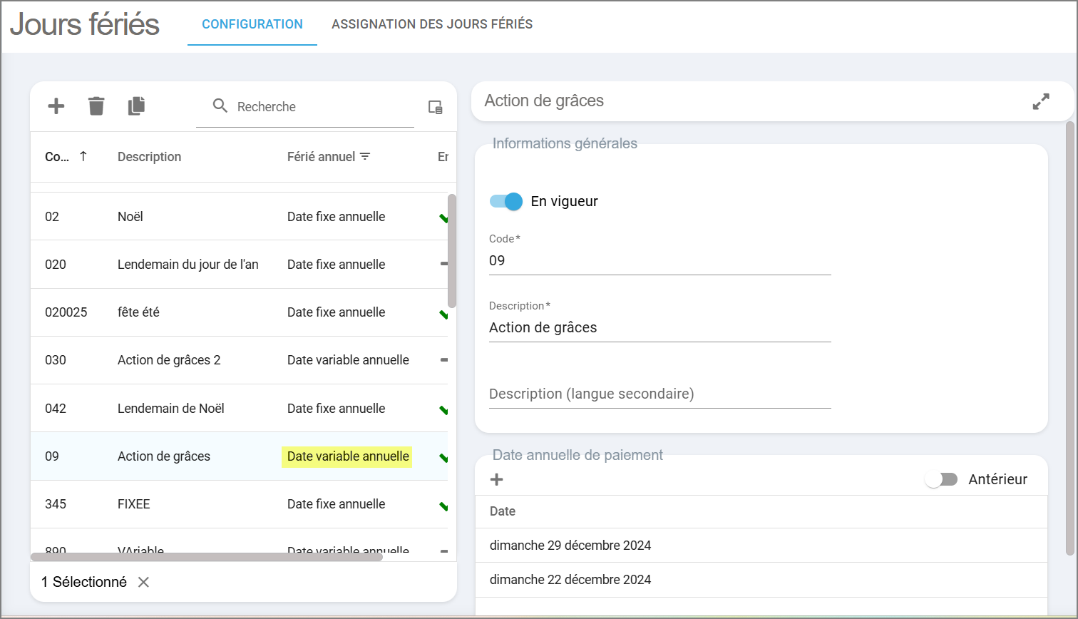 En cliquant sur un jour férié, un panneau de détails s'ouvre à droite. Vous pouvez l'agrandir avec les flèches inversées en haut à droite. La liste des jours fériés générés, ainsi que leurs dates de paiement, est visible au bas de la page et inclut les jours à venir et passés.