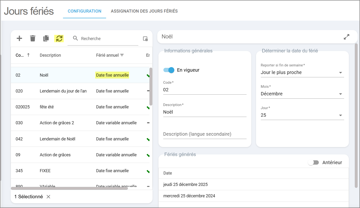Cette option vous permet d'afficher les dates qui ont été générées antérieurement pour ce férié.