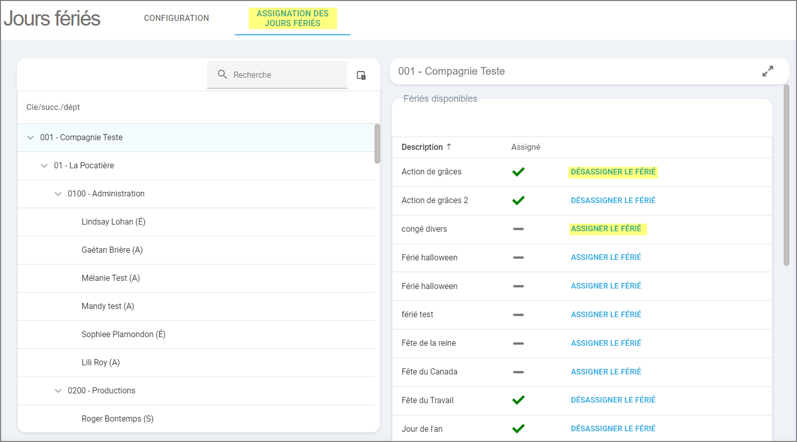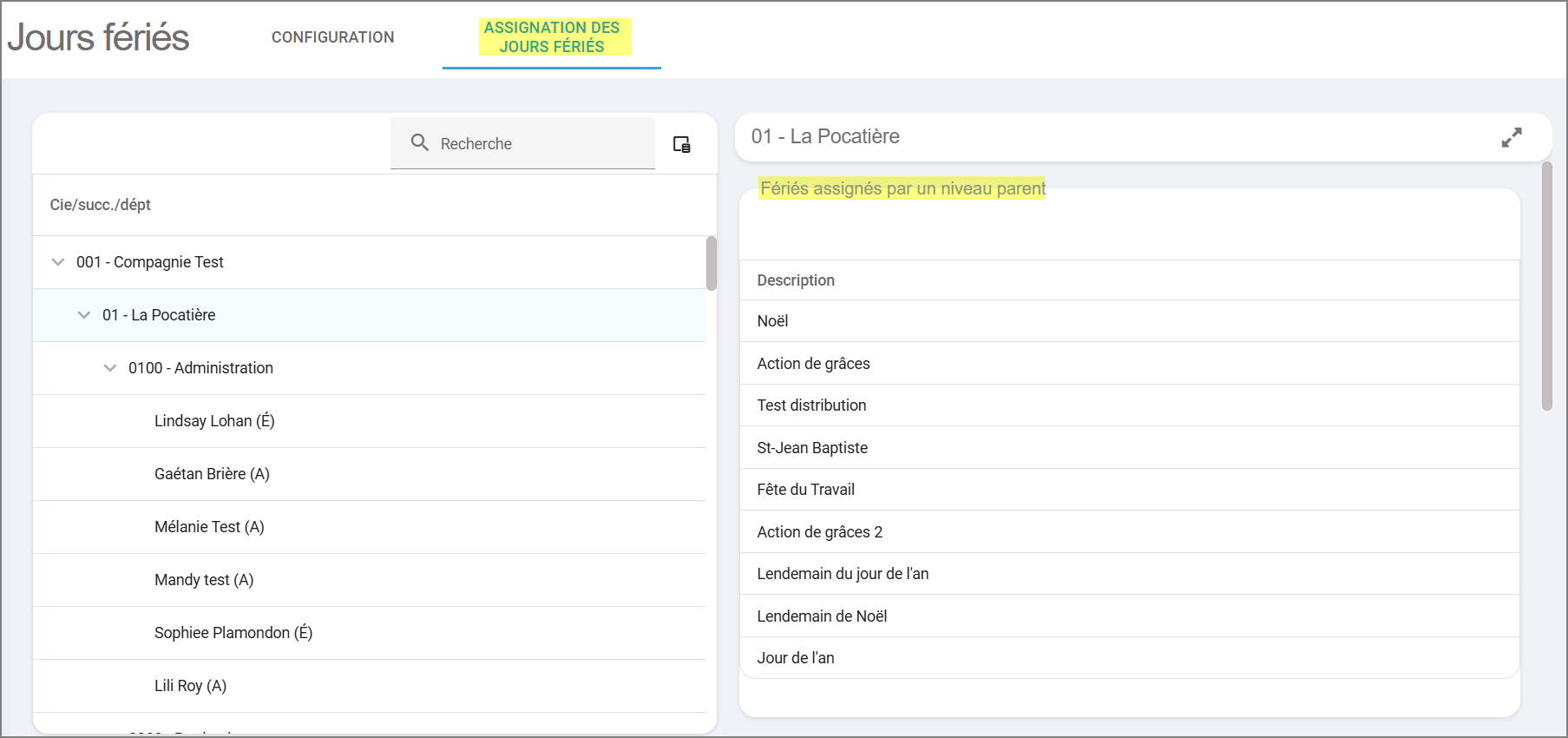 Il est ainsi possible d'assigner des jours fériés à une compagnie, à une succursale, à un département ou bien directement aux employés en question.