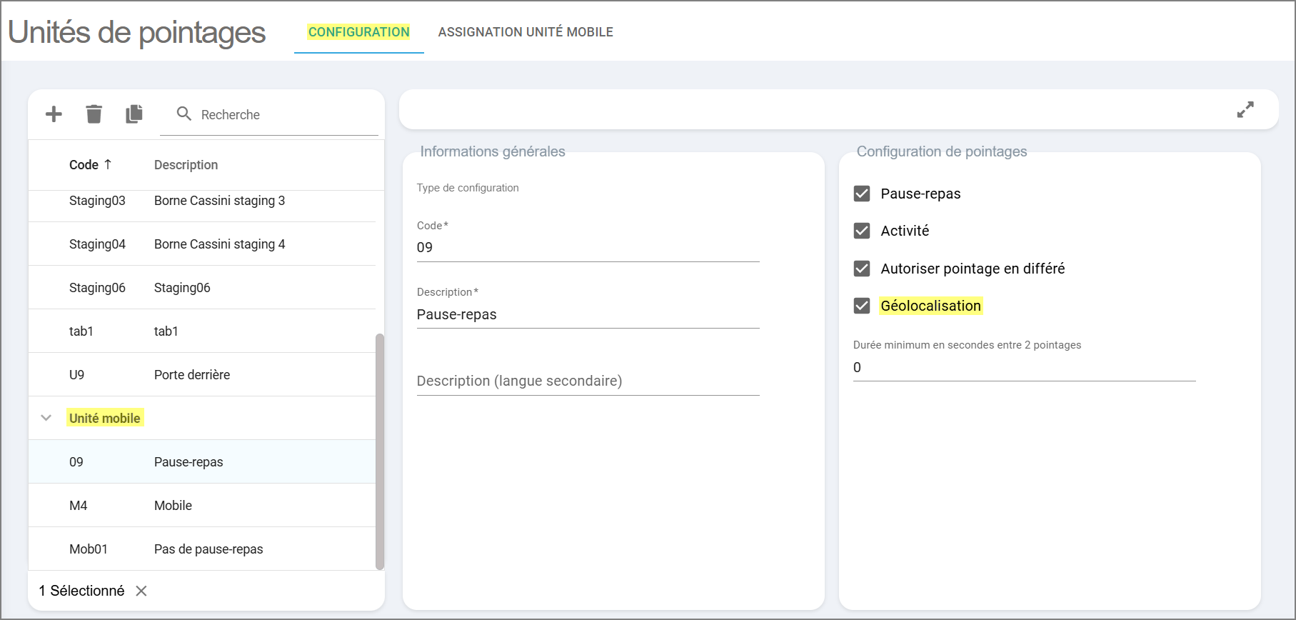 Si vous utilisez la fonction de géolocalisation, il est important d'aller activer la fonction dans Unités de pointage, plus précisément via les bornes mobiles et cocher la case de la Géolocalisation. C'est de cette façon que le téléphone cellulaire est en mesure de détecter s'il faut ou non collecter la position des employés.