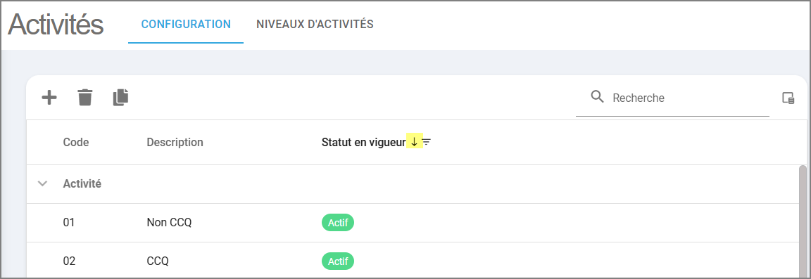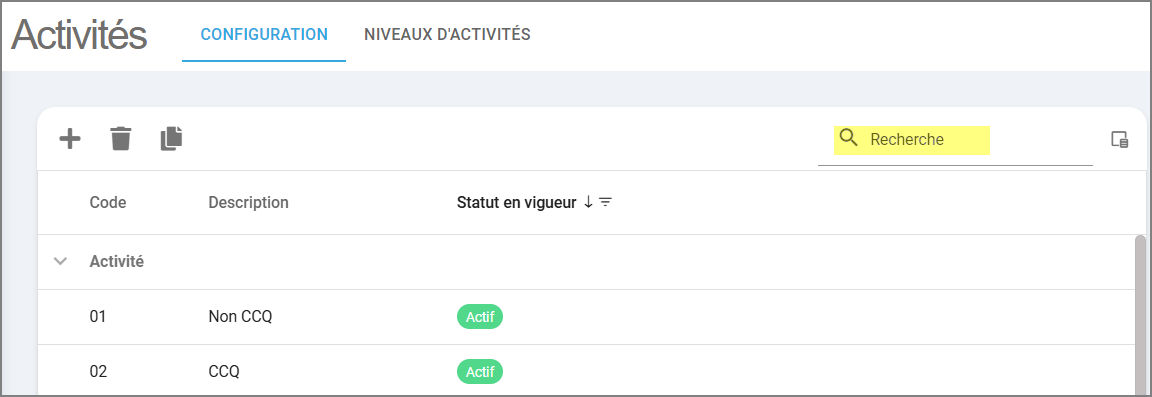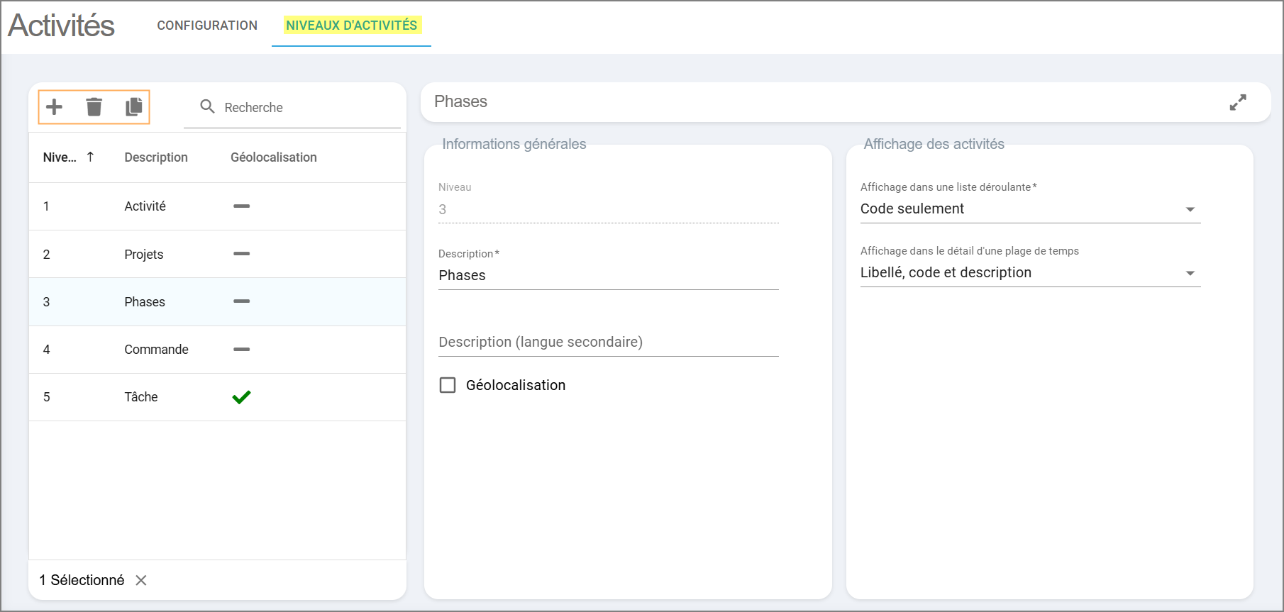 La première étape lors de la configuration de vos activités est de créer vos niveaux d'activités. Pour ce faire, utilisez l'icône ajout .