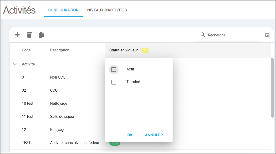En cliquant sur les petites lignes à côté de l'entête de colonne Statut en vigueur, vous pouvez effectuer un filtre sur le ou les statuts au choix, pour une recherche plus rapide et facile.