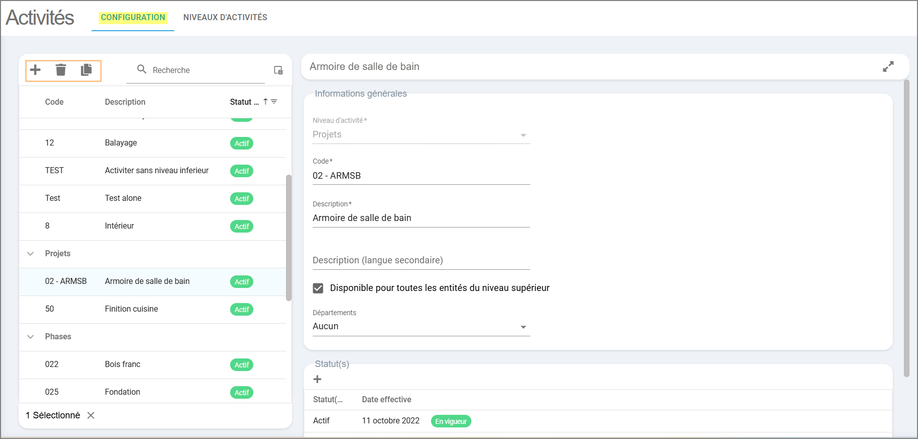 Indiquer le statut de l'activité soit Actif, Inactif ou Terminé avec la date d'entrée en vigueur du statut. Ce champ est obligatoire.