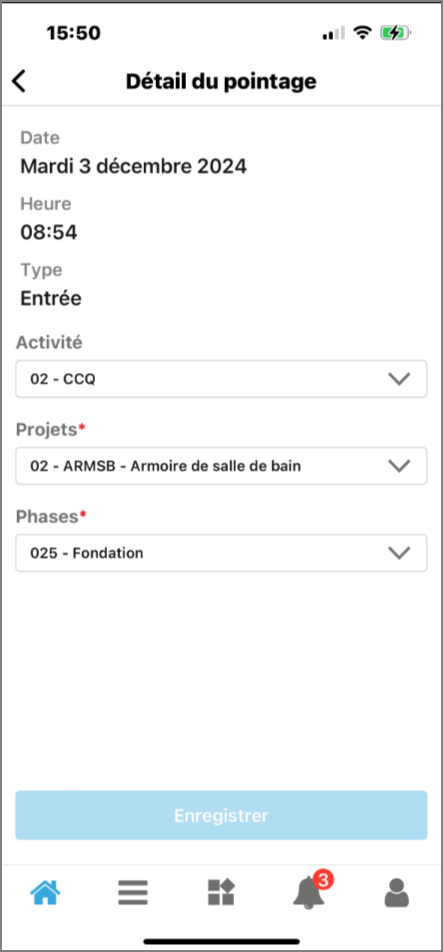 Cliquez sur le pointages ou le changement de projet que vous aimeriez en modifier la sélection de vos activités.