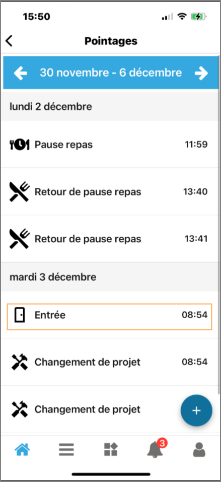 Dans le menu Pointages, vous êtes en mesure de modifier les activités que vous avez sélectionné soit directement dans vos entrées ou bien lorsque vous avez effectué un changement de projet.