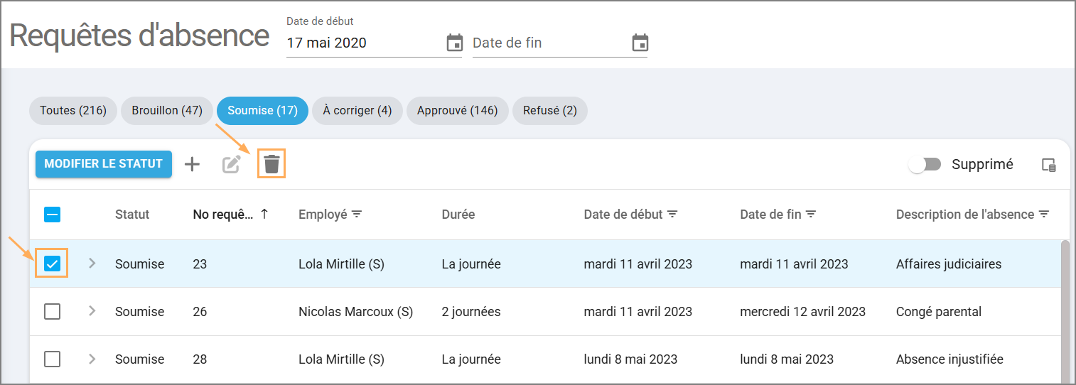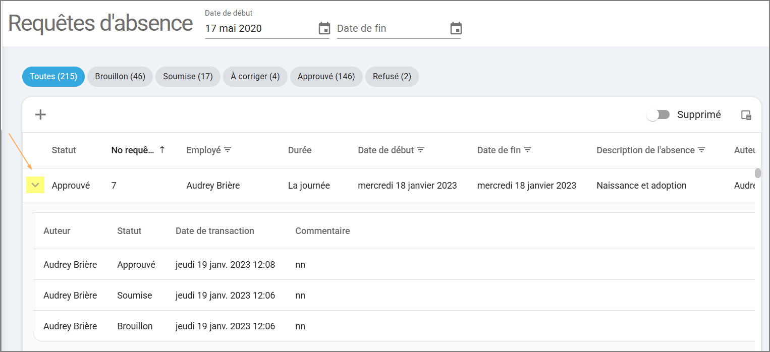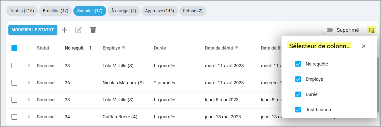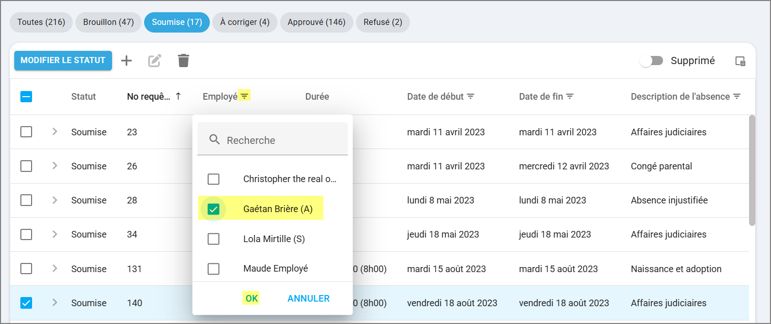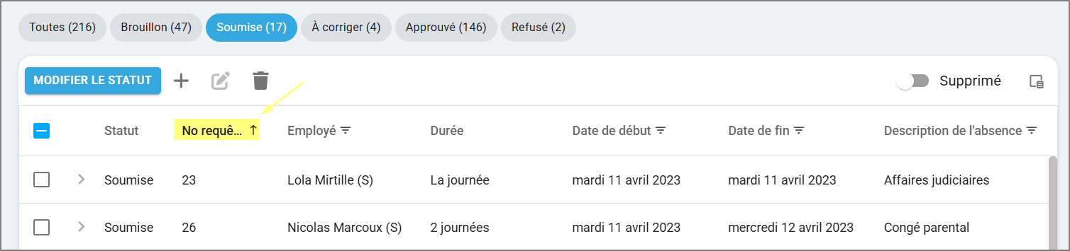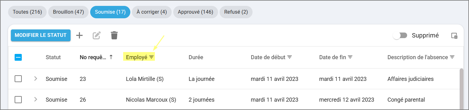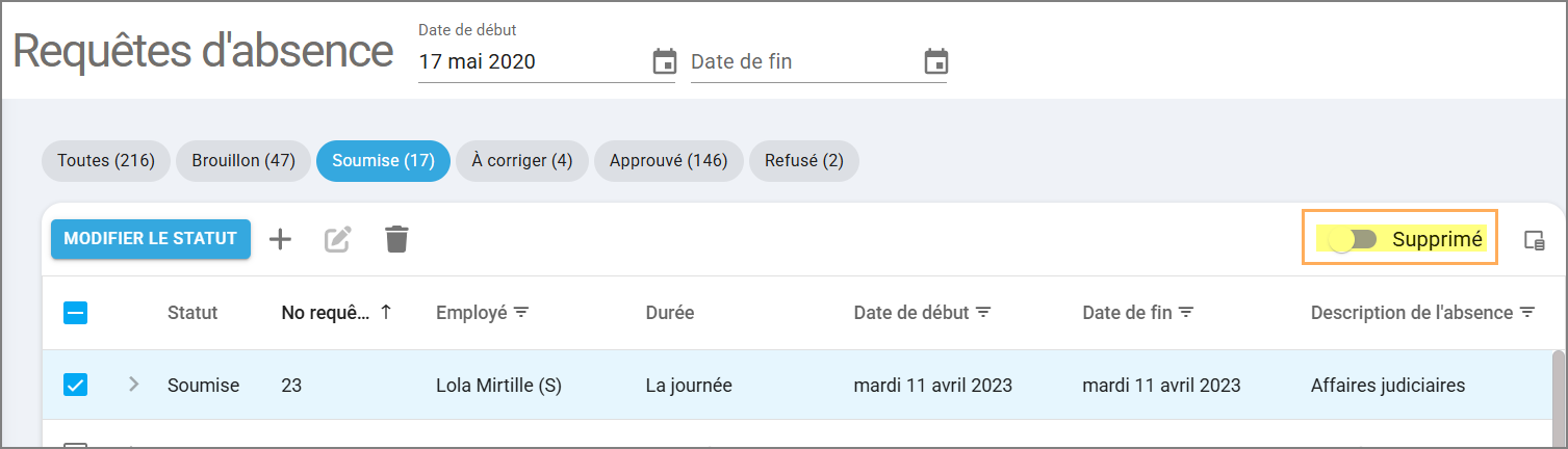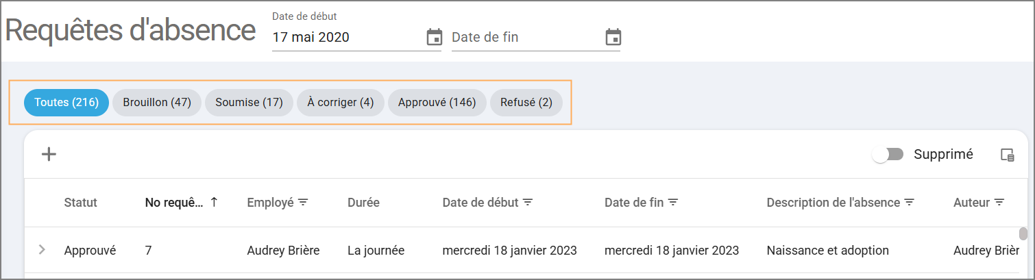 Supprimé : Affiche les requêtes supprimées (par l'employé ou le gestionnaire). Pour activer ce filtre, cliquez sur le bouton à côté de "Supprimé".