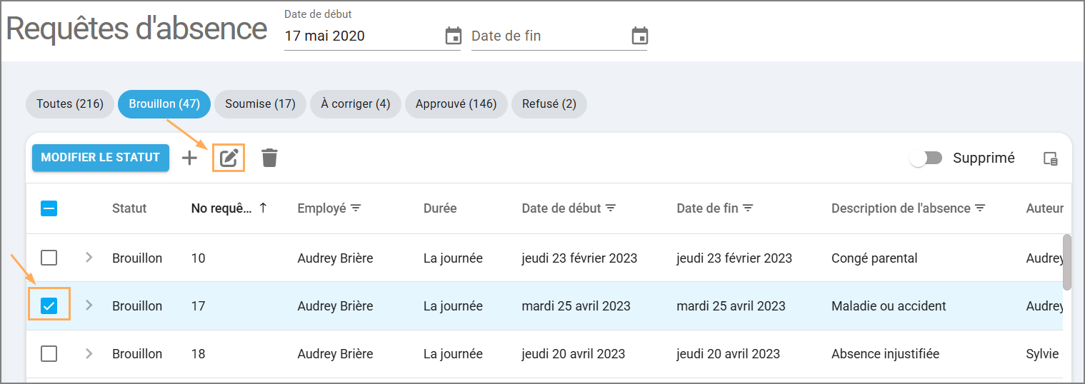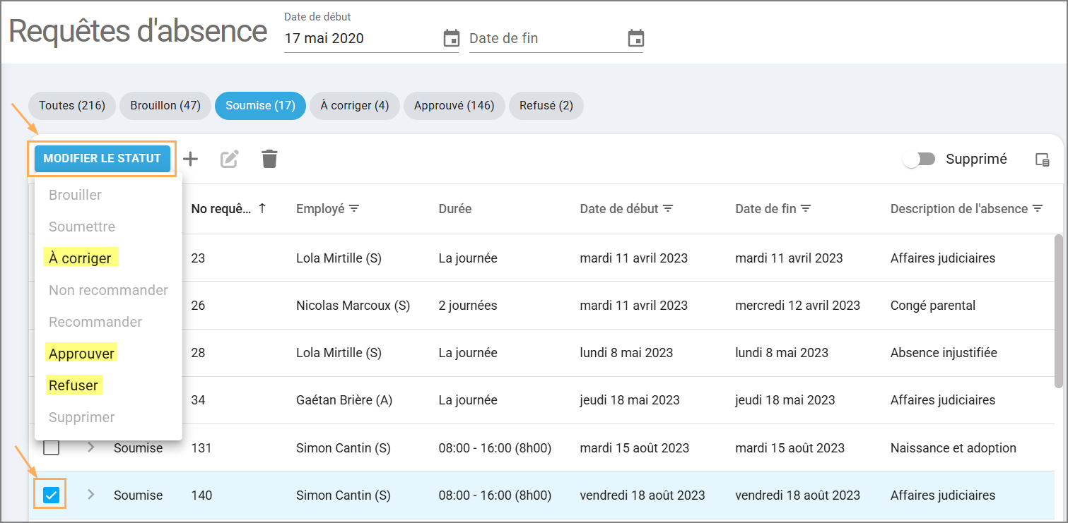 Il est possible de changer le statut d’une ou de plusieurs requêtes d’absence à la fois. Pour ce faire :