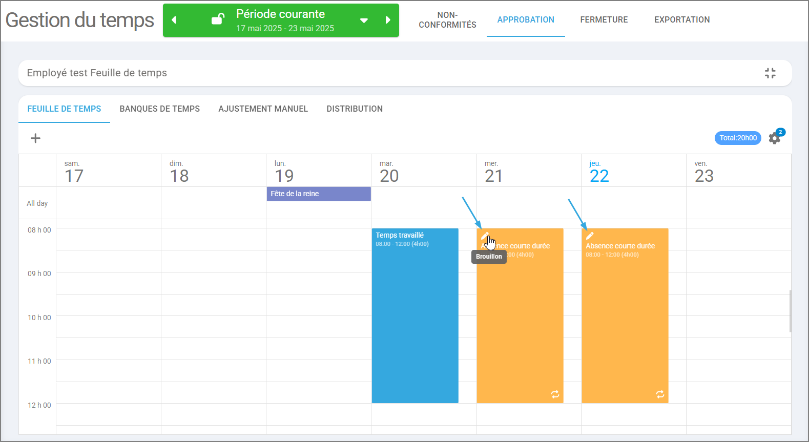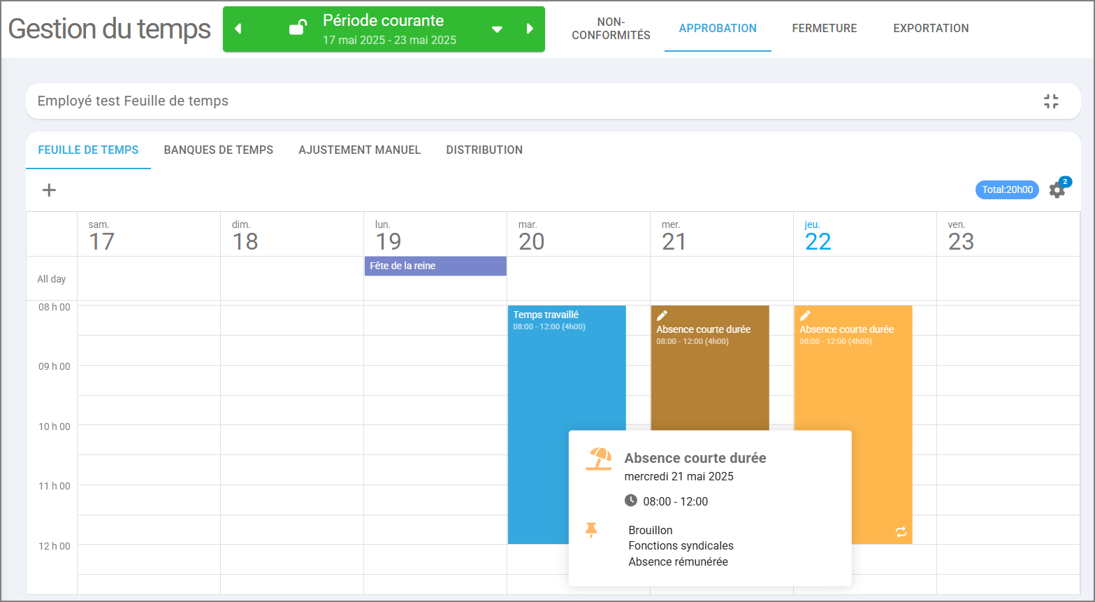 L’affichage des requêtes d’absence a été pensé pour faciliter leur repérage et leur gestion dans la feuille de temps :