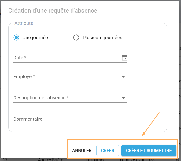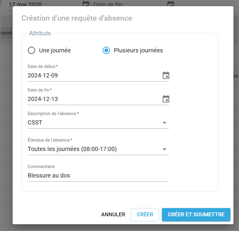Créer et soumettre : crée la requête et la soumet automatiquement à votre superviseur pour approbation. Le statut de la requête passera à Soumise.