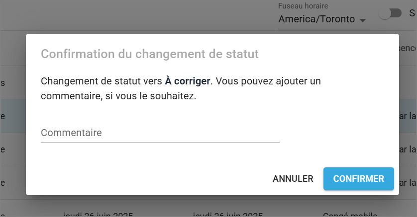 Lorsque vous modifiez un statut pour « à corriger » ou « refusé », vous pouvez ajouter un commentaire. Ce commentaire apparaîtra dans l’info-bulle de la feuille de temps (pour les employés utilisant le mode feuille de temps) ainsi que dans la notification envoyée à l’employé. Cela lui permettra de comprendre rapidement ce qu’il doit corriger dans sa requête ou pourquoi celle-ci a été refusée.