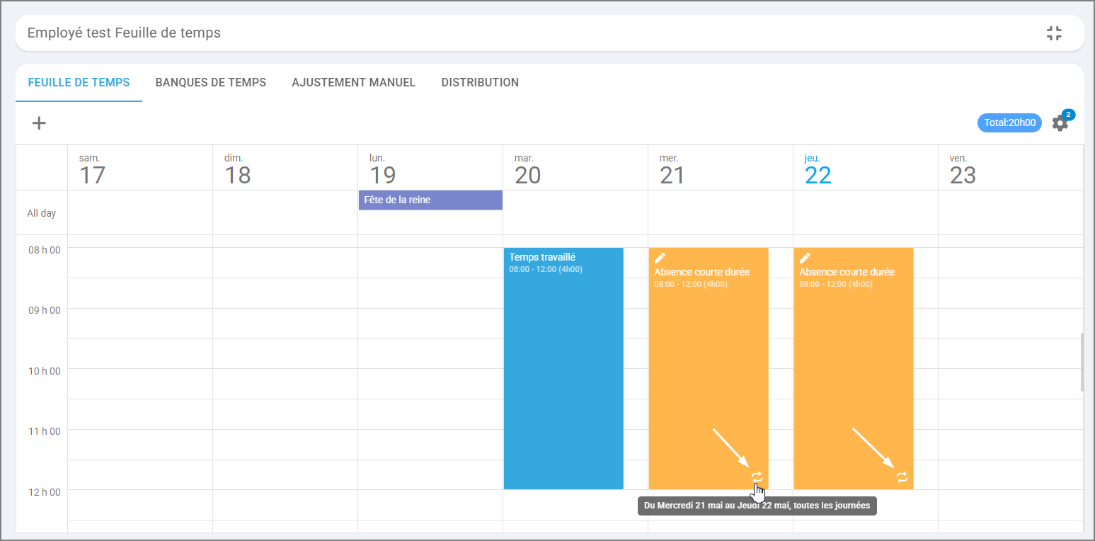Lorsqu’une requête s’étend sur plus d’une journée, une icône de récurrence s’affiche dans le bas de la plage d’absence. Cela permet de repérer facilement qu’il s’agit d’une seule et même requête multi-jours, et non de requêtes distinctes pour chaque jour. En passant votre souris sur l’icône vous êtes en mesure de voir les dates exactes que s’appliquent cette requête.