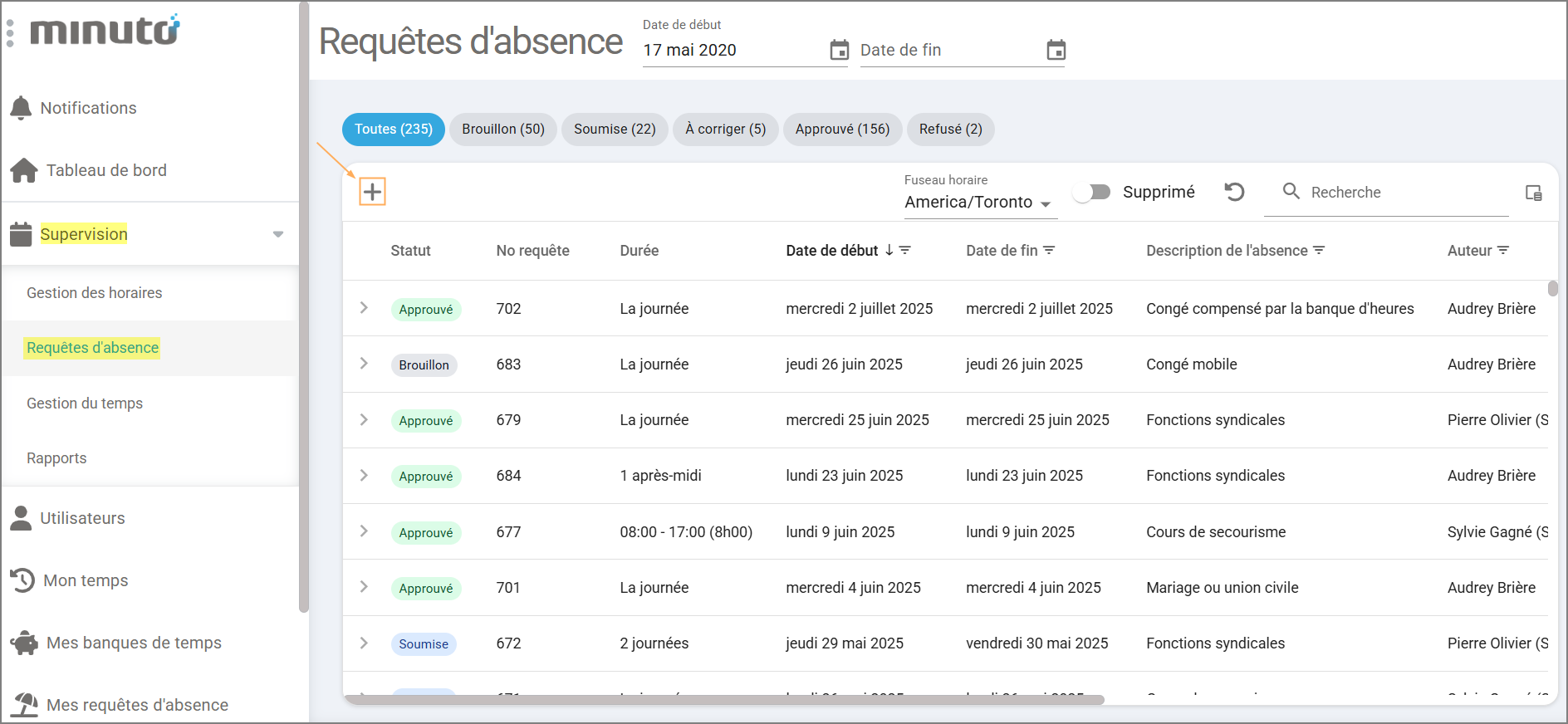 Dans Minuto, le module de requêtes d’absence vous permet de gérer facilement les absences de vos employés. En tant que superviseur, vous pouvez créer de nouvelles requêtes, en modifier le contenu ou encore en changer le statut (ex. : soumise, approuvée ou refusée), le tout à partir d’une seule interface claire et intuitive.