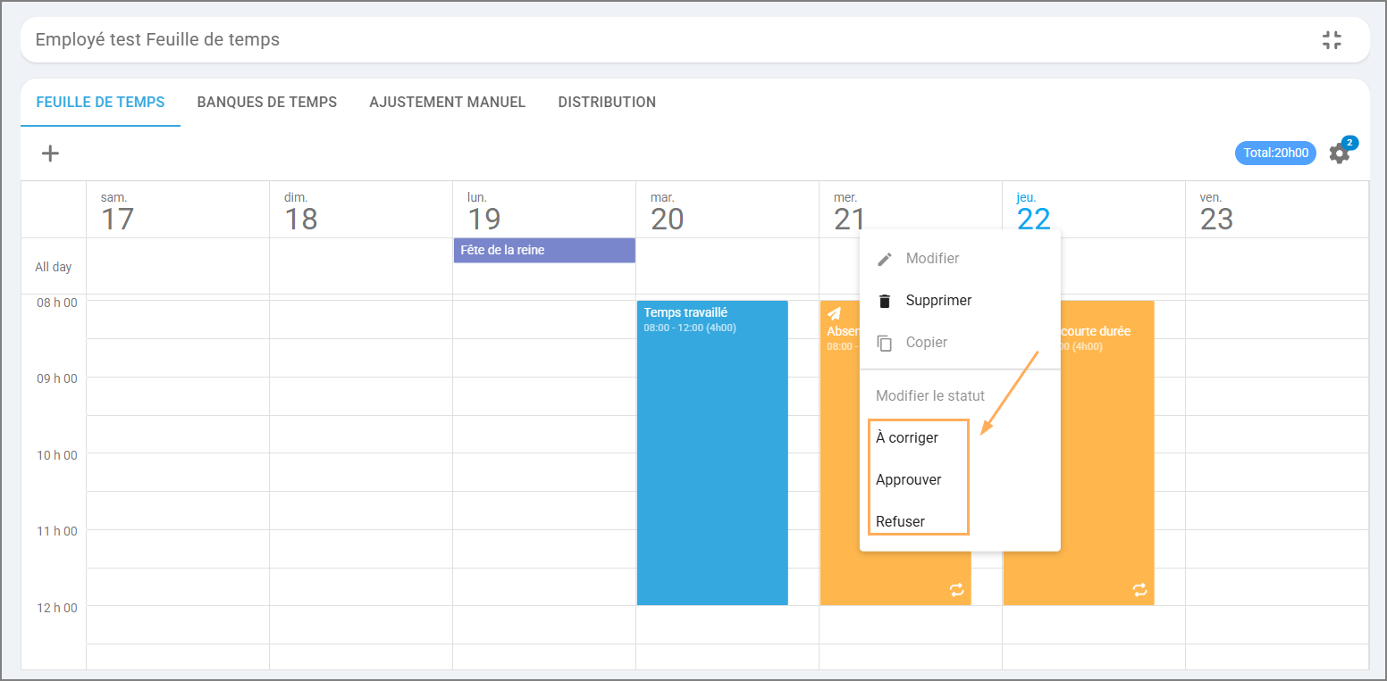 Pour changer le statut d’une requête d’absence directement depuis la feuille de temps :