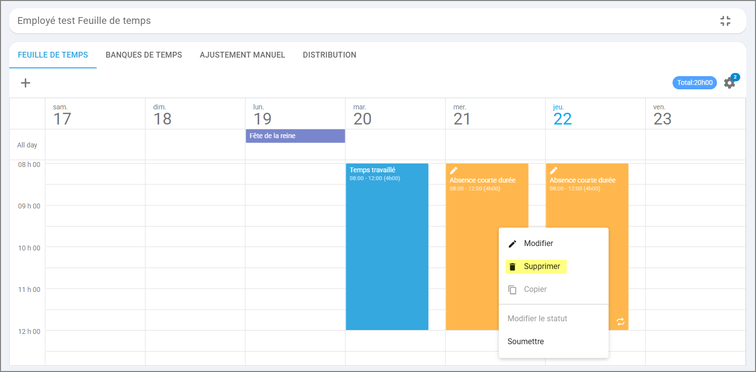 La suppression d’une requête d’absence depuis la feuille de temps est simple :