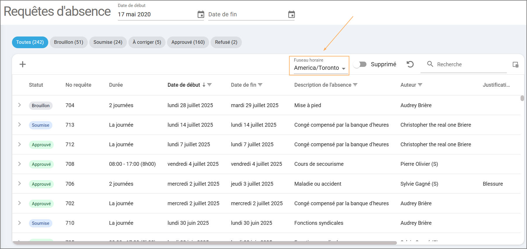 Toutes : Affiche toutes les requêtes d'absence pour la période sélectionnée.