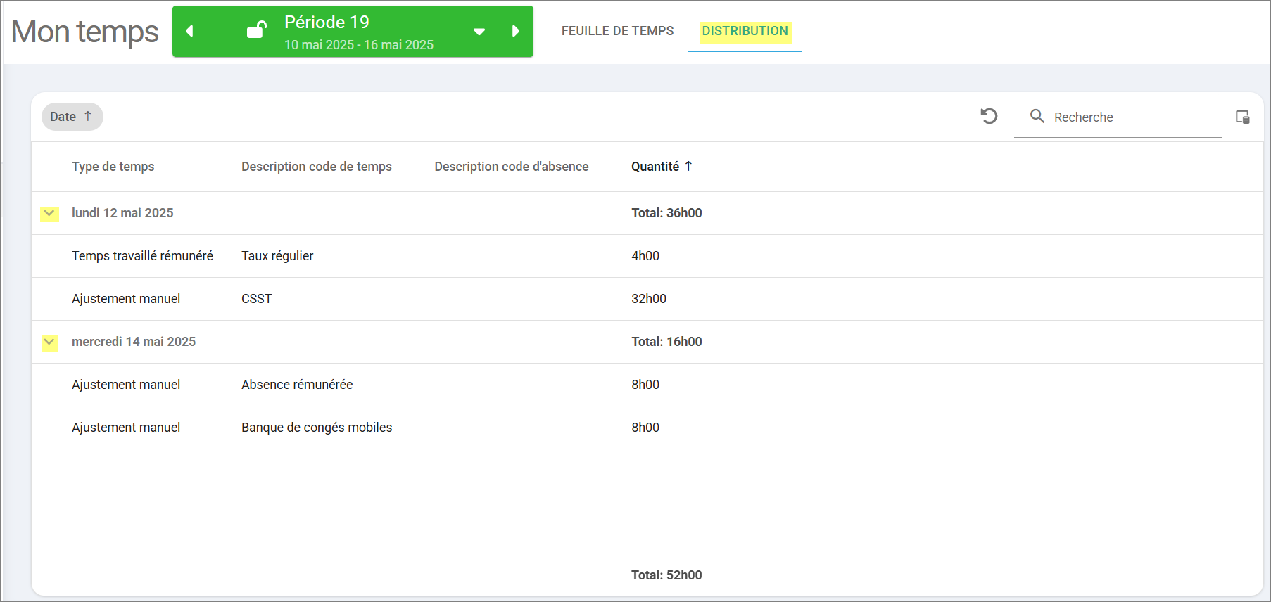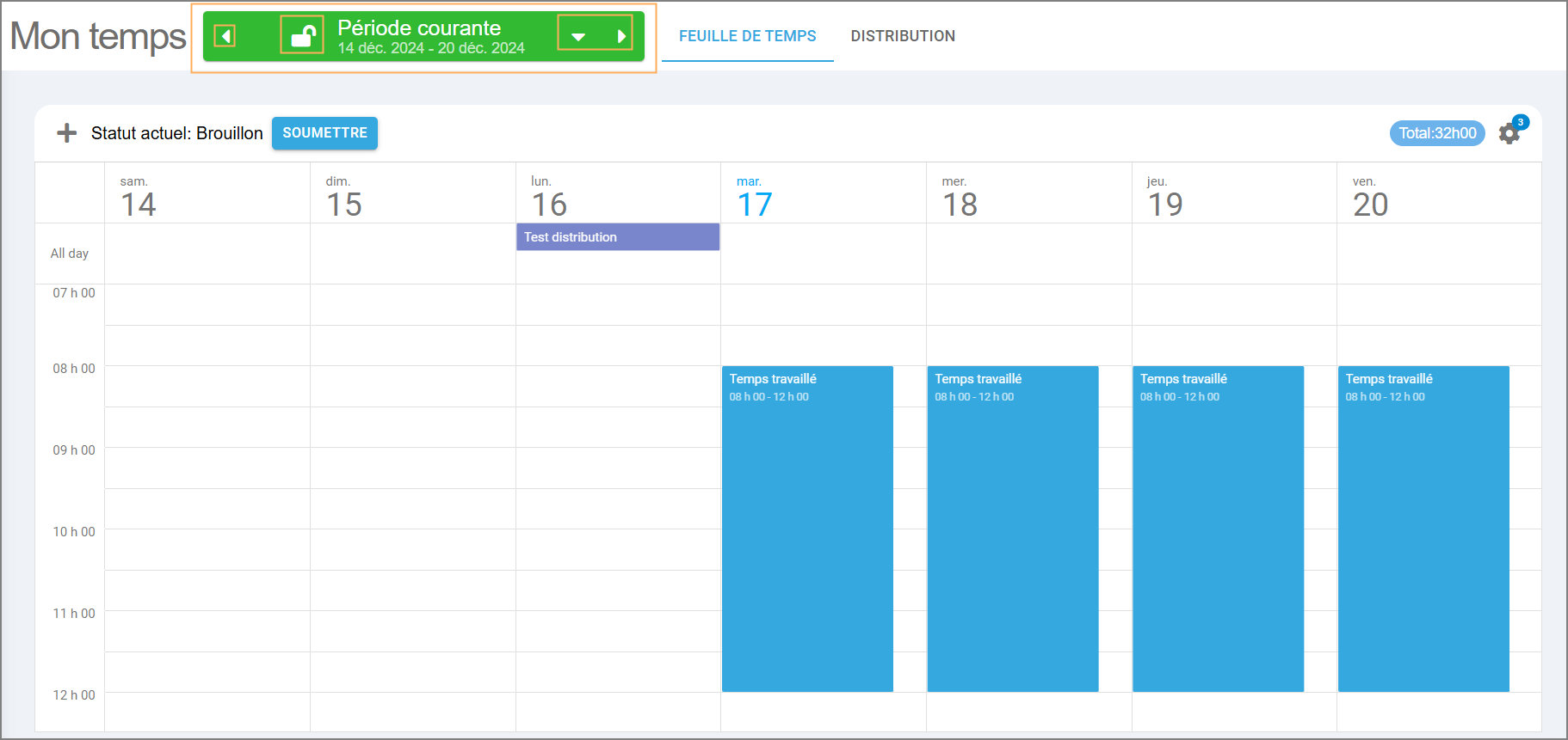 Vous avez accès aux onglets Feuille de temps et Distribution