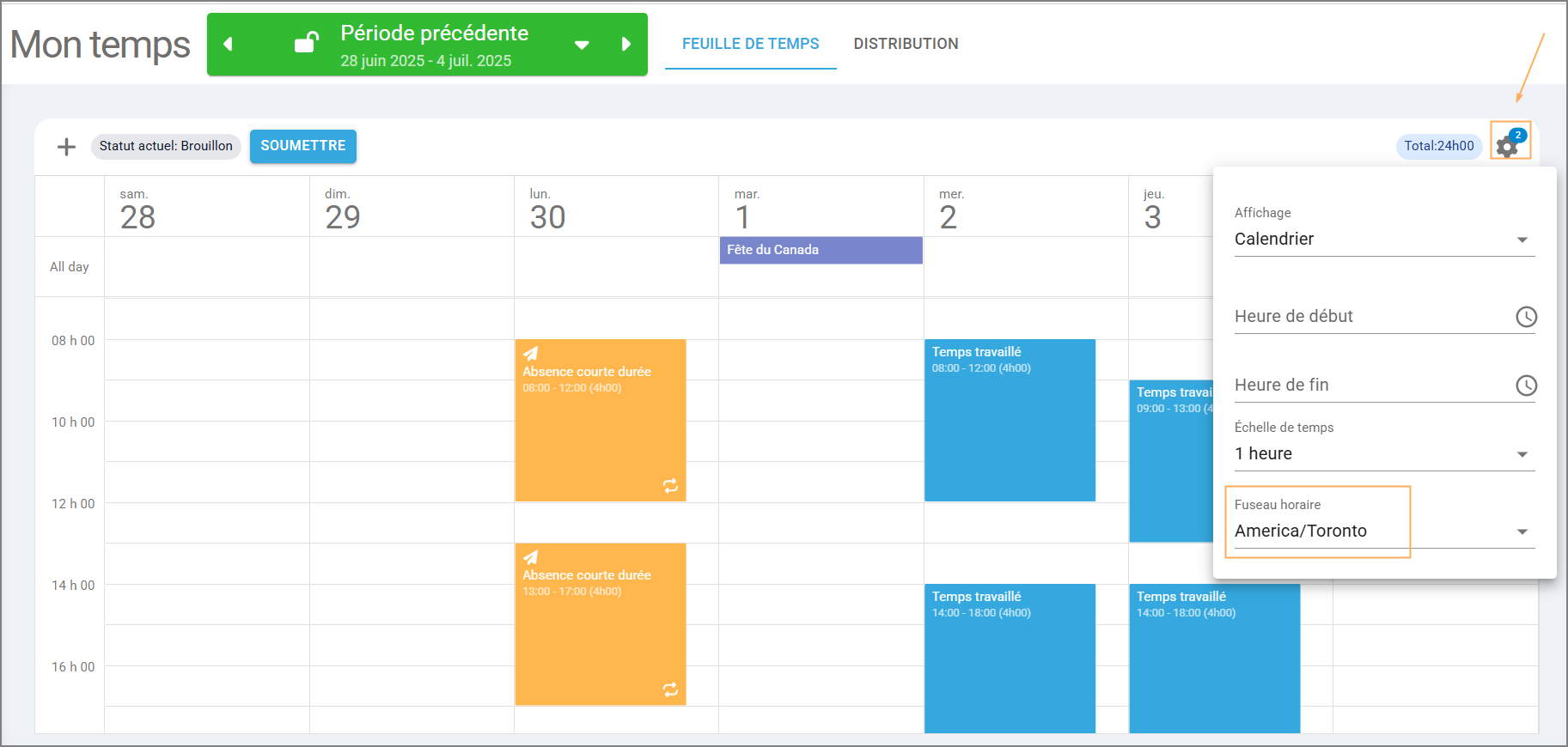 Paramètres de temps : À côté du total des heures, cliquez sur