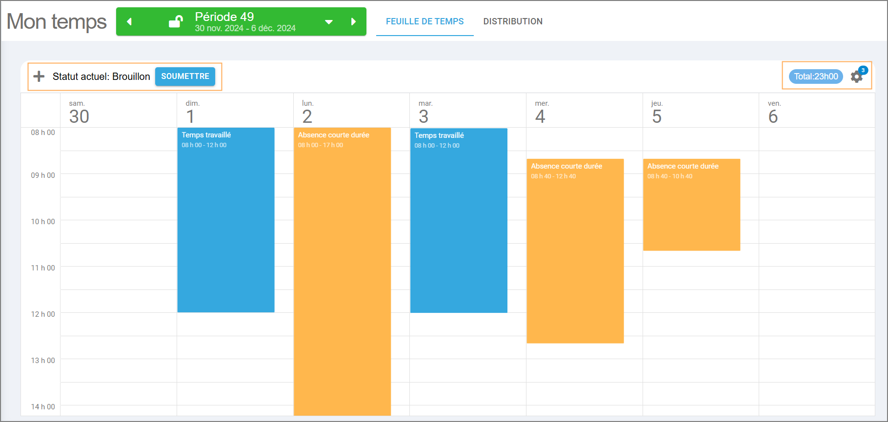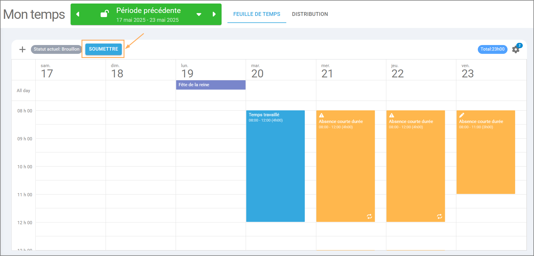 Une fois votre feuille de temps complétée, il ne vous reste qu’à cliquer sur le bouton Soumettre (en bleu). Son statut passera alors automatiquement de Brouillon à Soumise.