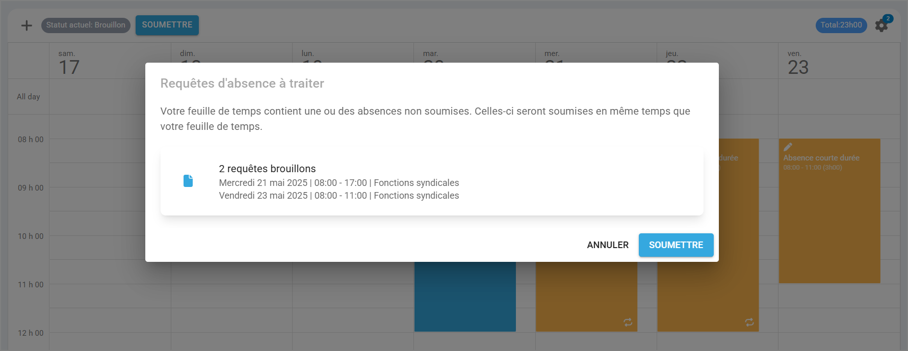 Si une ou plusieurs absences sont en brouillon, un message s’affichera pour vous les résumer. Ces absences seront soumises automatiquement en même temps que votre feuille de temps. Aucun geste supplémentaire n’est requis de votre part.