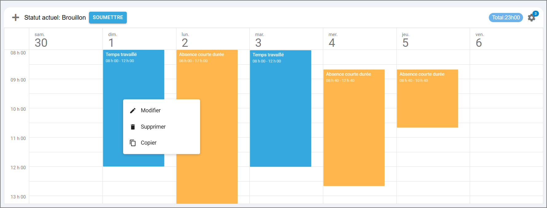 Copier : pour copier une plage horaire et la coller ailleurs dans la feuille de temps