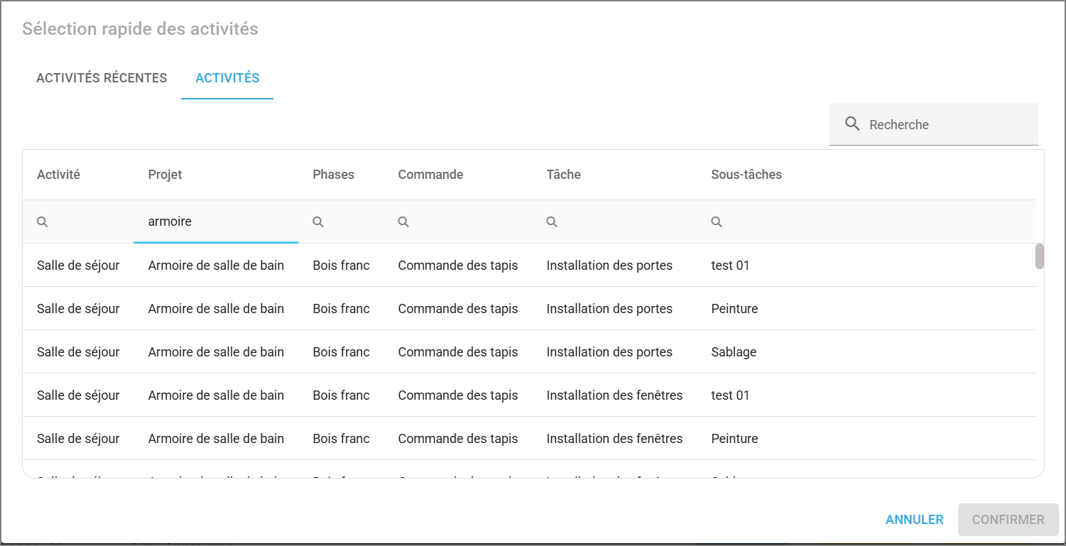 Recherche rapide des activités