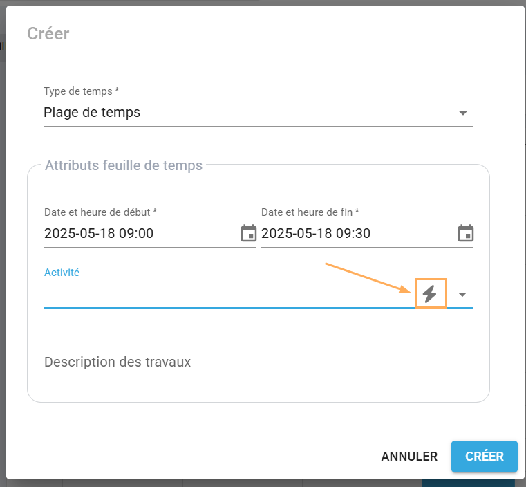 Pour y accéder lorsque vous créez ou modifiez une plage de temps, vous n’avez qu’à cliquer sur l’icône d’éclair situé sur la ligne du champ Activité.