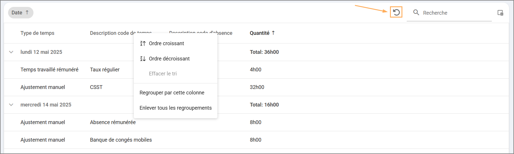 Autre option: cliquez sur l’icône en forme de flèche en rond dans le haut de la grille. Elle permet de réinitialiser la grille à son état initial, en supprimant tous les regroupements, tris et filtres actifs.