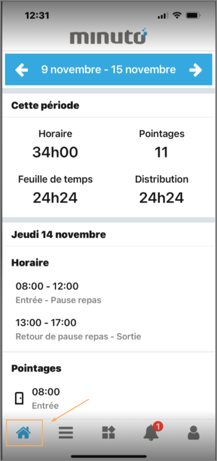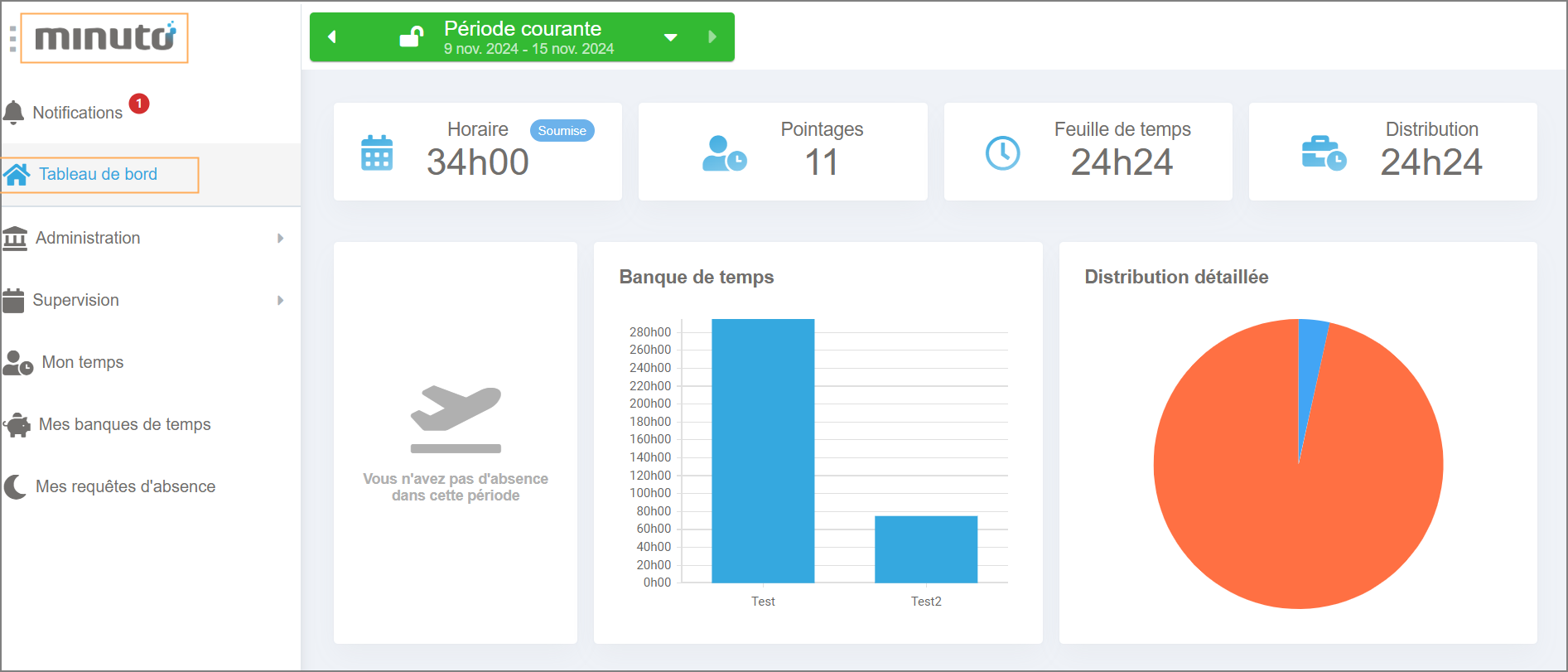 Accès : Cliquez sur Minuto ou Tableau de bord pour ouvrir une vue d’ensemble, avec la période actuelle affichée en haut.