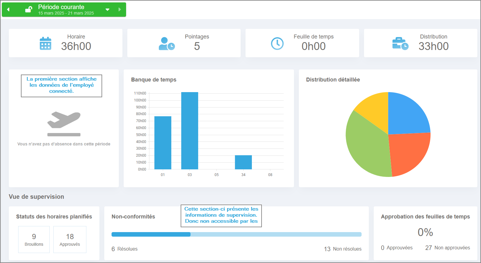 La section du bas “ Vue de supervision “montre les données de supervision ou d’administration, variables selon les employés supervisés.
