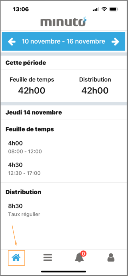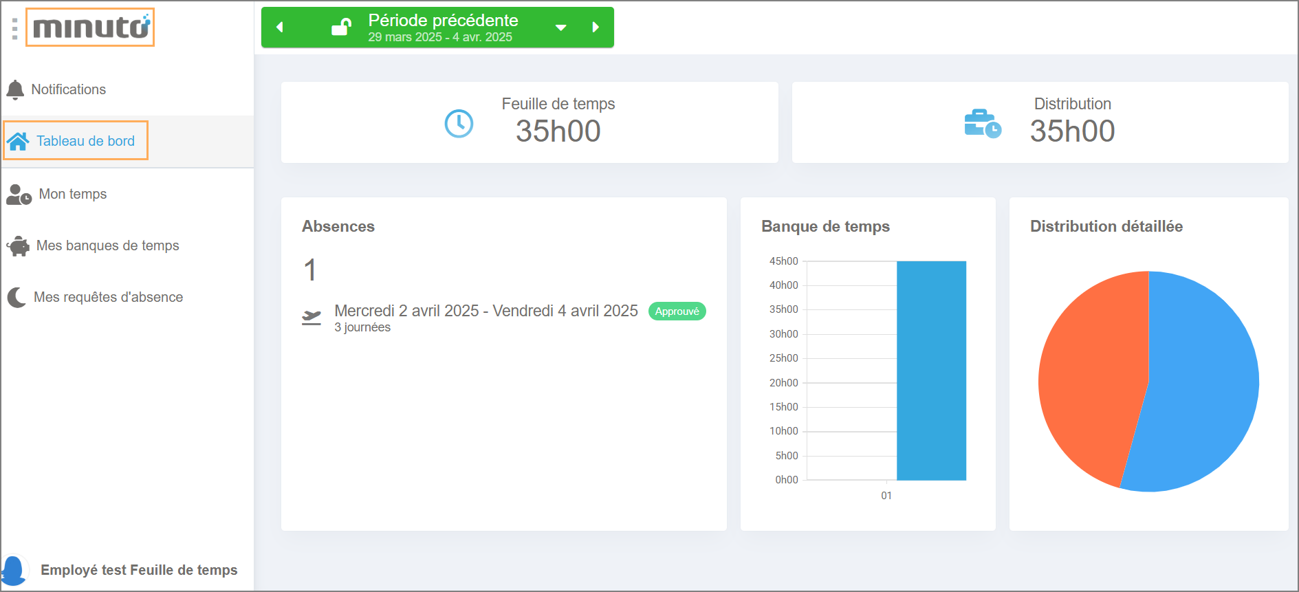 Accès : Cliquez sur Minuto ou Tableau de bord pour ouvrir une vue d’ensemble, avec la période actuelle affichée en haut.