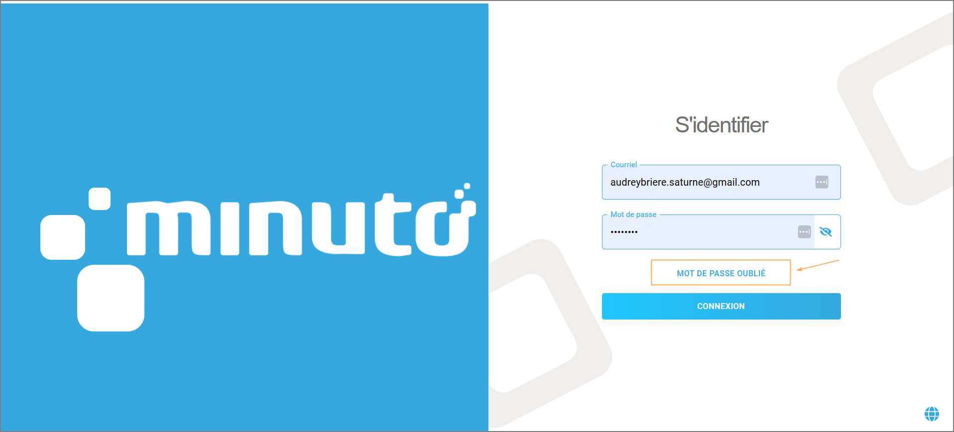Suite à la création de votre compte dans Minuto, vous pouvez en tout temps réinitialiser rapidement votre mot de passe via la page ''Login'' de l'application ou bien le modifier à votre convenance via la page Profil.