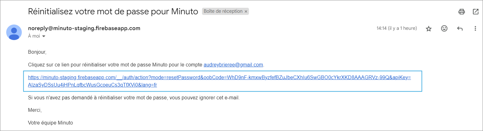 Cliquez sur le lien dans le courriel. Ensuite, une fenêtre apparaitra vous demandant d'entrer votre nouveau mot de passe et de confirmer celui-ci. Lorsque toutes les informations seront inscrites, vous pourrez ainsi vous connecter à l'application avec votre nouveau mot de passe.